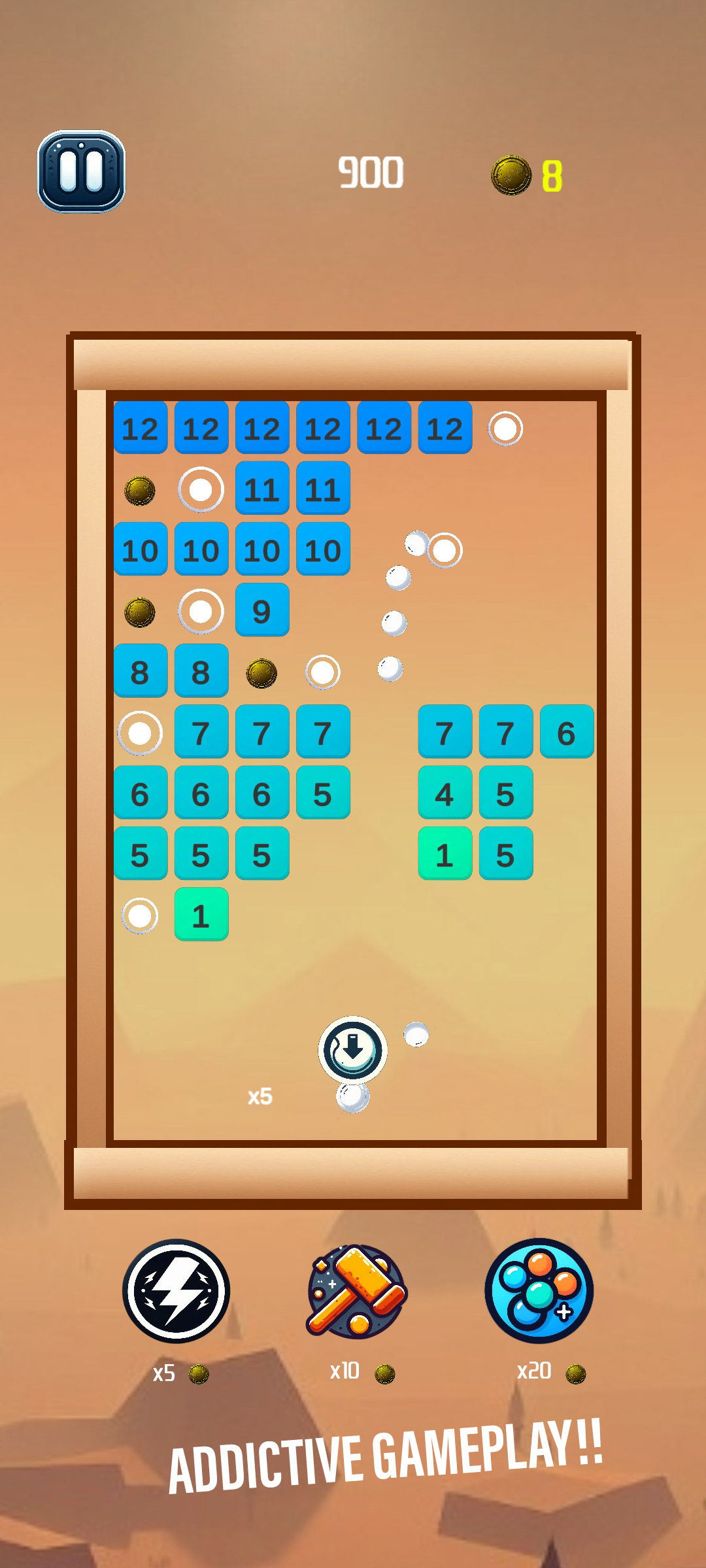 核心遊戲玩法包括使用槳將彈跳球引向磚牆,打破磚牆並賺取積分。如果方塊撞到牆的底部,玩家就會失去生命。
